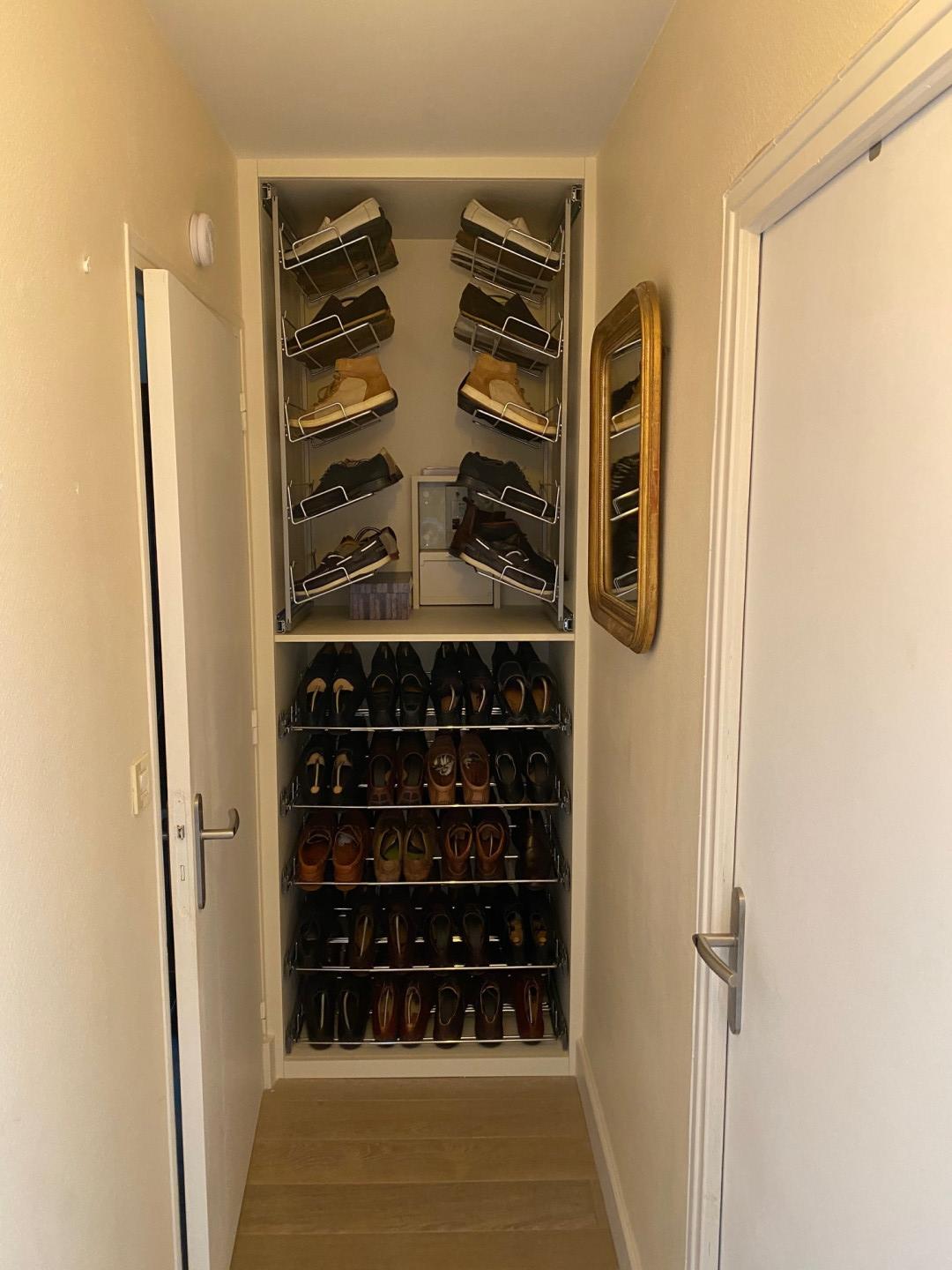 Deux grands cadre coulissant, avec des étagères en fil chromé, permettant chacun le rangement de 12 paires.