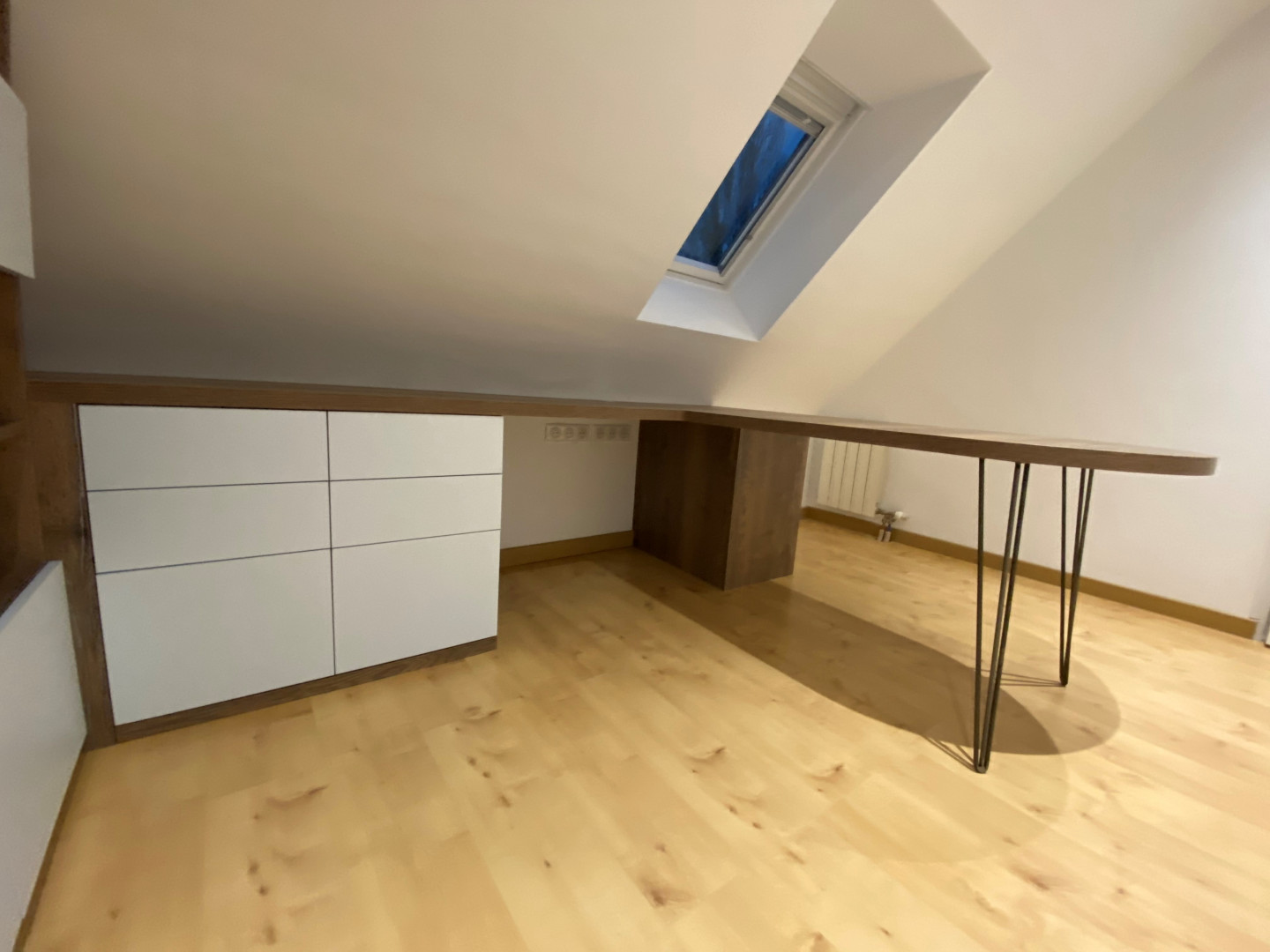Aménagements sur mesure, sous pente, Chêne Hallifax Zinc et Bleu glacier.
